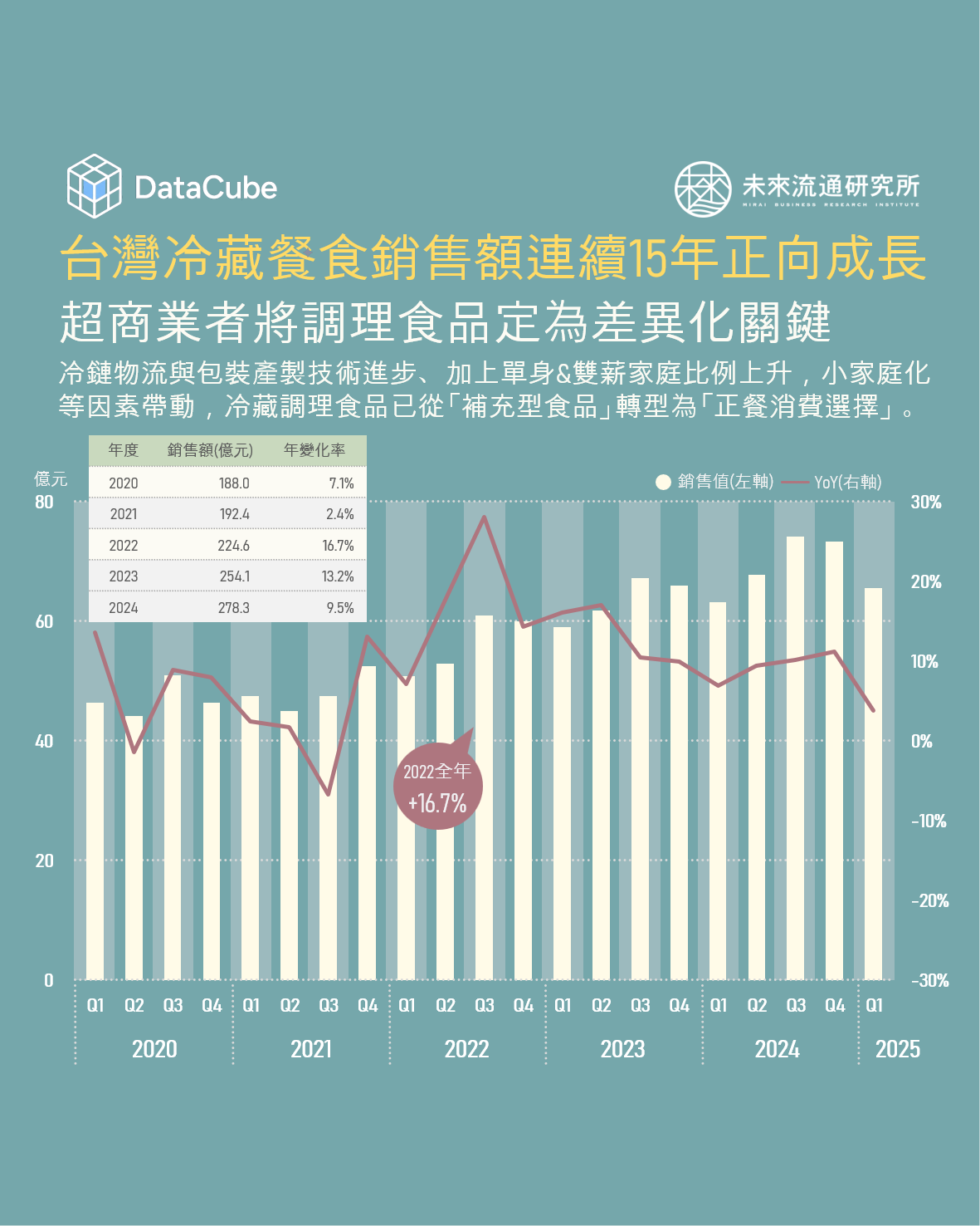 冷鏈物流與包裝產製技術進步、加上單身&雙薪家庭比例上升,小家庭化等因素帶動,冷藏調理食品已從「補充型食品」轉型為「正餐消費選擇」 。